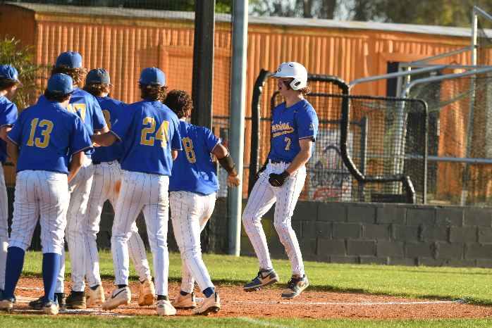 Ethan Lynskey celebrates with his teammates at the plate after hitting a home run. *Photo by Amy Teed.
